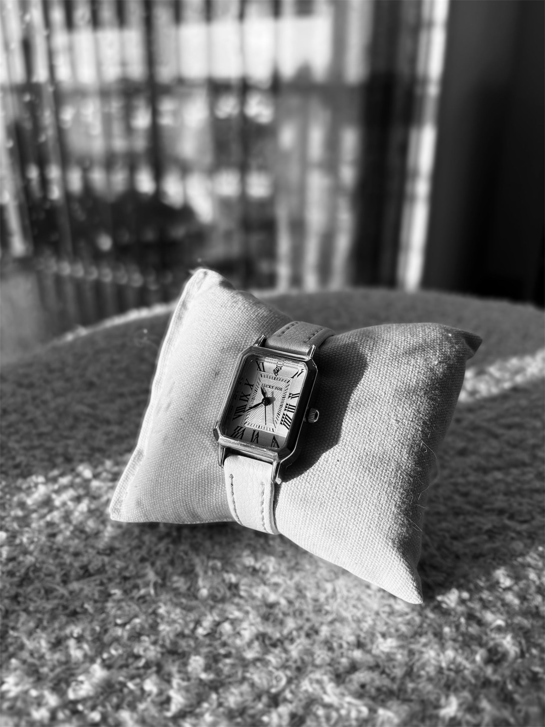 Son cadran rectangulaire doré et ses aiguilles noires offrent un style épuré et intemporel, tandis que le bracelet en similicuir assure confort et sophistication.